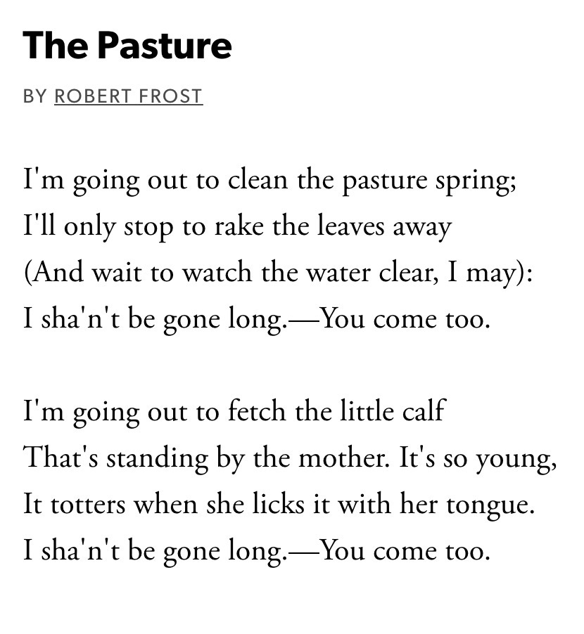 That was how Frost opened his first collection of poetry, North of Boston, and how he began many of his public readings. It’s a lovely set of words and images, through which the speaker introduces himself and his place. It’s springtime, he’s a farmer, he’s got tending chores to do. And he’s got a keen eye and a way of seeing and speaking that make us want to hear more. He paints a little picture of the near future of his intentions. And then, and only then, comes an invitation, and an invitation almost as an afterthought: that full stop, that em dash. It’s the kindest, most gentle imperative imaginable, and by the end of the poem we’re already on our way out to that pasture with him, he’s already taken us out to that pasture, and we’ve got a sense that what we’ll see there - in the literal space of leaves and water as well as the metaphorical space of the poems to come. If we turn the page or continue listening, it’s because we’re willingly along for the ride, there’s something we want to hear and see, we’re not being coerced or forced or shamed.